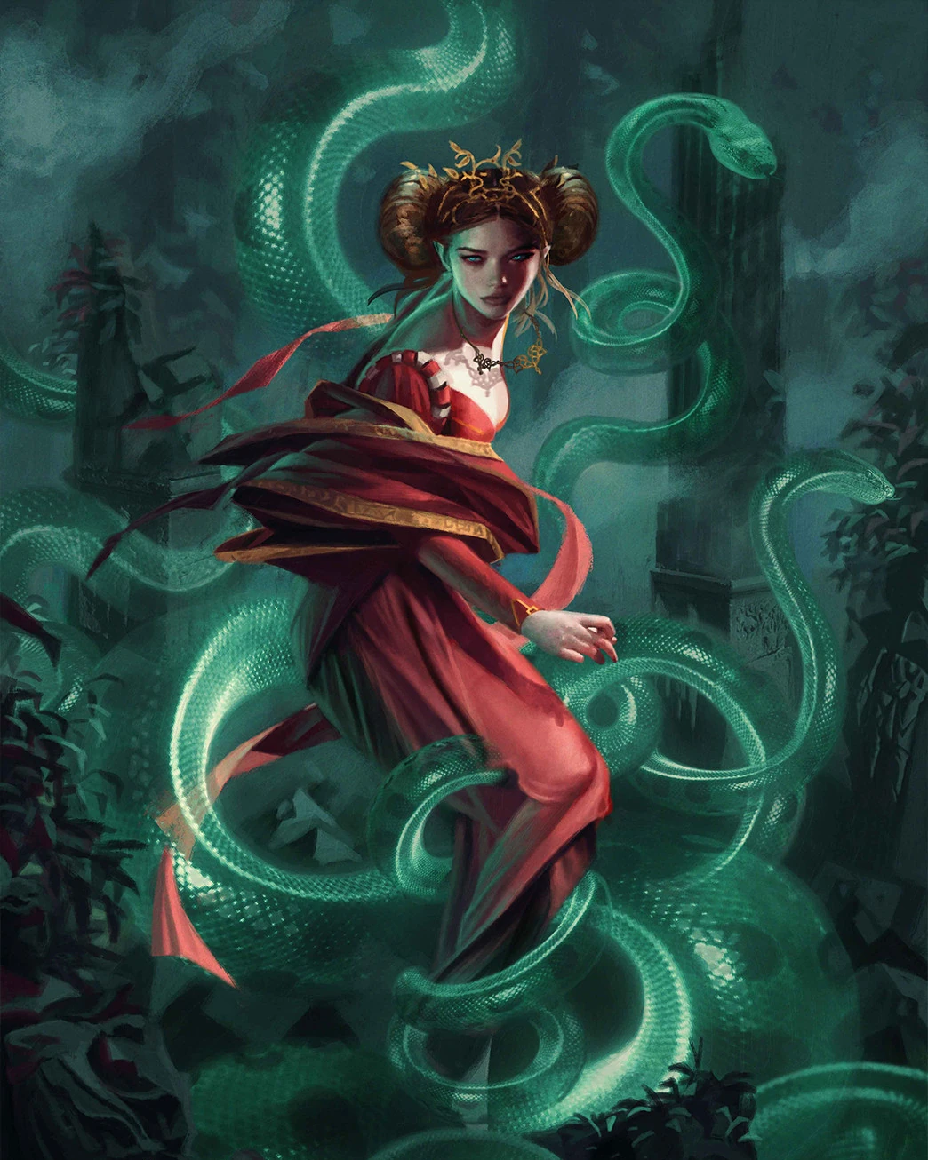Se la consideraba la mujer más bella del mundo por un amplio margen, y tenía el pelo largo y dorado y un vestido verde grisáceo decorado con encaje, que susurraba cuando se movía. Sus ojos azules de elfo eran tan inescrutables y duros como el cristal.[4]