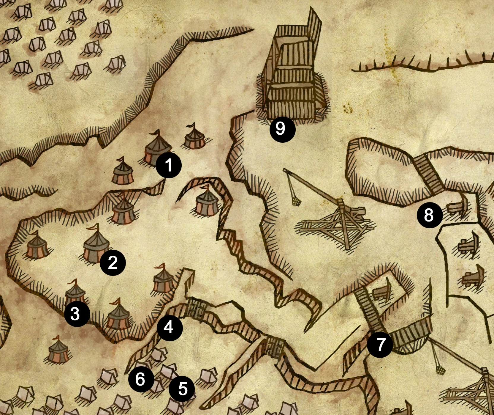 A poca distanza dalla tenda di Triss, Geralt incontra anche alcune vecchie conoscenze, i Razziatori di Crinfrid. Parlando con loro Geralt dà inizio alla prima missione secondaria del gioco, che si protrae sino al Capitolo I: "Il Cuore di Melitele".