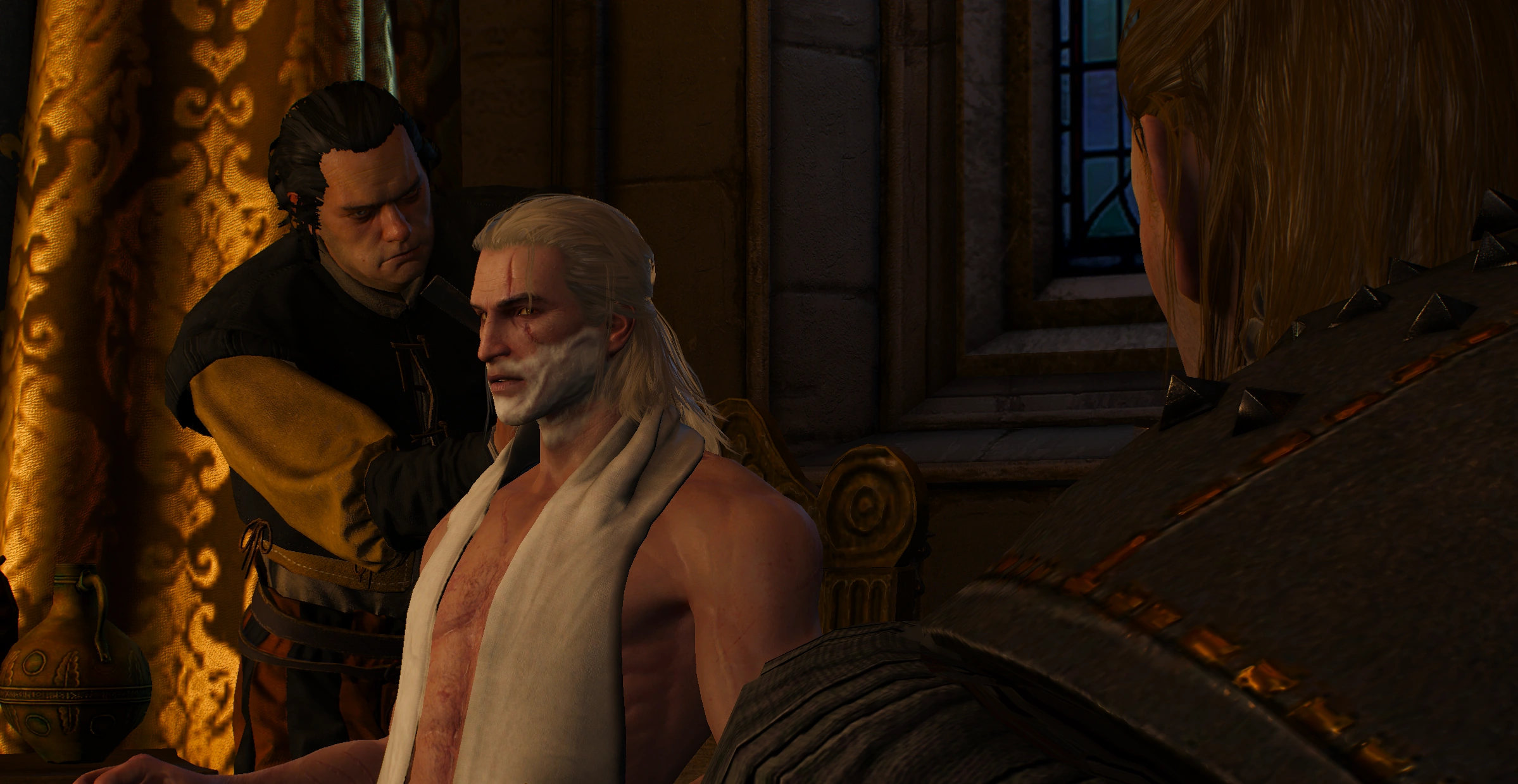 La missione inizia con Geralt che viene pulito da alcune donne nilfgaardiane in una vasca da bagno, affinché sia presentabile per l'udienza. Il bagno viene interrotto dal ciambellano di Emhyr, Mererid, e dal suo assistente, Cledwyn. Il ciambellano ispeziona Geralt e giunge alla conclusione che la sua barba deve essere tagliata, perché infestata da pidocchi. Mentre Cledwyn rade Geralt, il generale Morvran Voorhis entra nella sala e approfittando della situazione, rivolge alcune domande al witcher sul suo passato. Le domande sono elencate sotto.