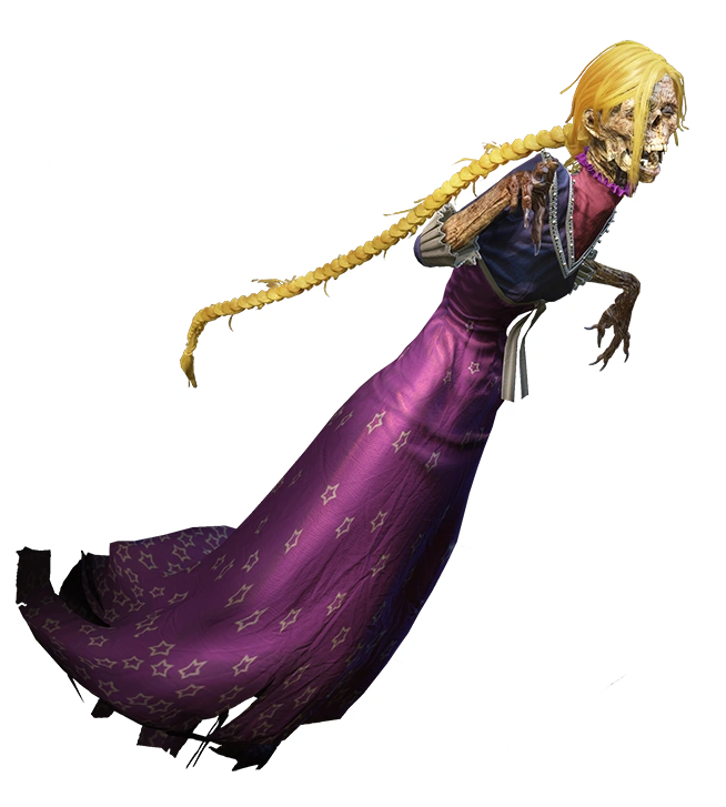 - Кожен знає, що історії кохання можуть закінчуватися трагічно, але мало хто здогадується, що це поширюється й на принцес із казок, які нібито мали б завжди закінчуватися щасливо. Довговолоска мала нещастя стати такою трагічною героїнею. Коли князівни підросли, а Країну тисячі казок занедбали, Довговолоска, по яку так і не прийшов принц, страждала від самотності, аж доки не повісилася на своїй же косі. А її привид лишився вартувати вежу, де дівчина чекала була на визволителя.