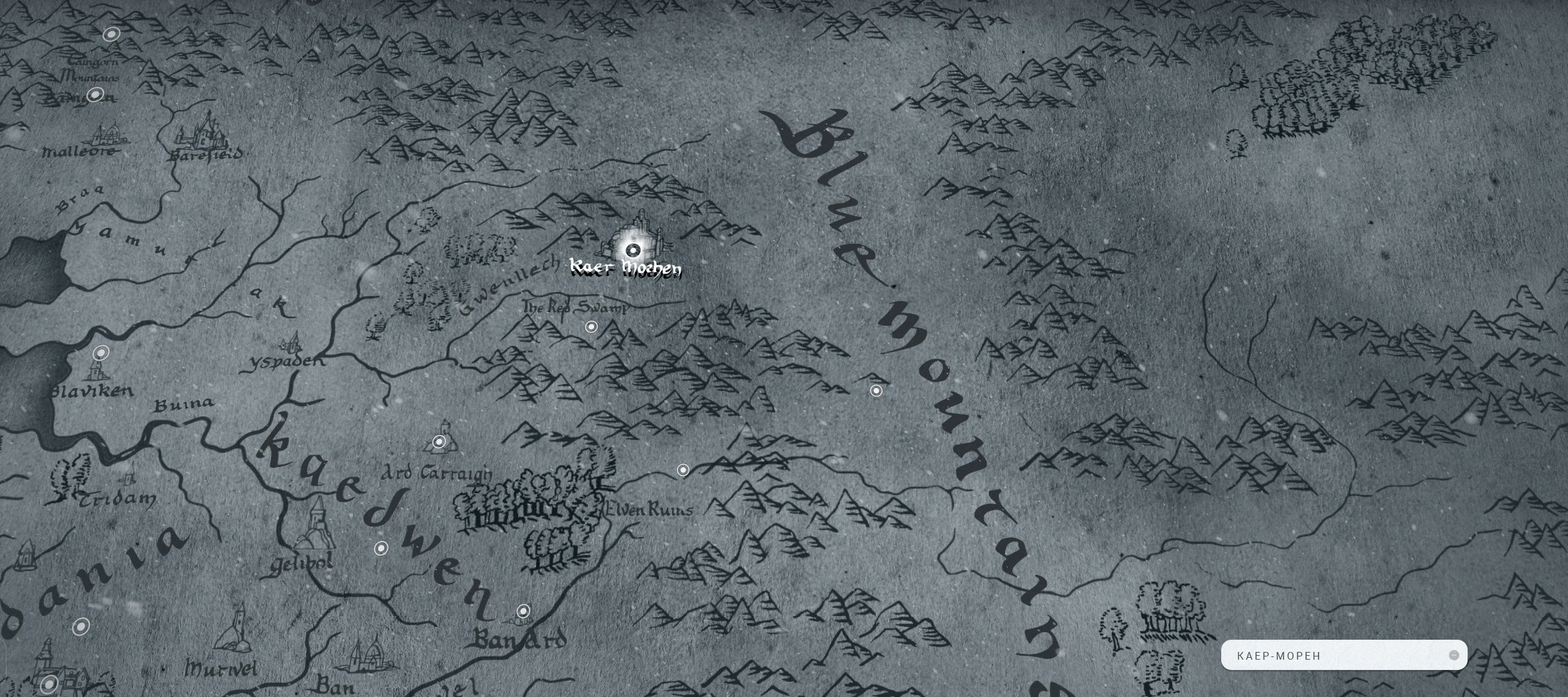 - Каер-Морен — неприступна гірська фортеця, в якій протягом багатьох століть розташовувалася гільдія відьмаків. Назва фортеці прийшла зі Старшої Мови, де Caer a'Muirehen перекладається як "Фортеця Старого Моря".