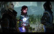 After landing in the forests west of Flotsam, Triss, Roche, and Geralt encounter Iorveth on their way to the town. Regardless of the witcher's dialogue options, you will be ambushed by a band of Scoia'tael. After casting a spell to ward off the arrows, Triss collapses; Roche then carries her while Geralt fights off elves who close for melee from ahead and behind.
