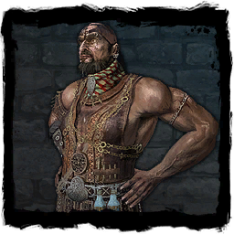 Azar Javed was a bald, swarthy Zerrikanian with a black beard and sinister gaze. He adorned his body with complex piercings and leather strap accessories, especially face and neck, as was the custom in his native land.[6] His look was completed by a leather jerkin full of chains and amulets hanging around and a pair of pointed shoes.