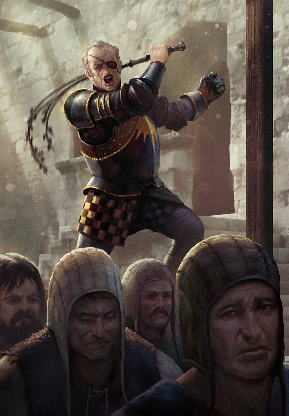 During the second Northern war, Nilfgaard invaded the kingdoms of Aedirn and Lyria; the capital city of Vengerberg, was conquered after a week of siege. Most of the population was butchered while the ones trying to escape towards Redania and Temeria were captured and enslaved by the Nilfgaardian cavalry. Slaves were in fact the cheapest workers for Nilfgaard. Riedbrune was one of the main slave sites under Nilfgaardian control. Prisoners of War from Lyria, Aedirn, Sodden, Brugge, Angren, and Temeria were forced to mine the stone caves in order to build a fortress.[3] In the capital and in the other settlements of Nilfgaard many slaves were trained in special schools in order to become gladiators. By 1272, slavery was still allowed in Nilfgaard and its provinces, like Vicovaro.[4]